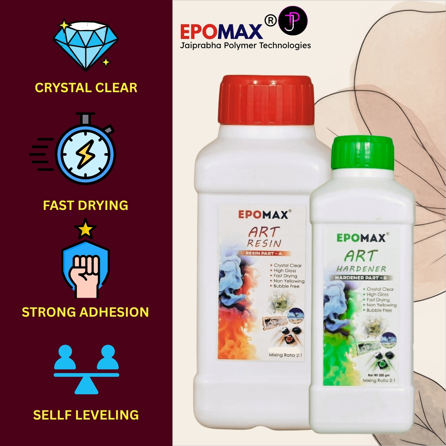 Jaiprabha Polymer Technologies presents premium quality Epoxy Art Resin specially manufactured for art and craft purposes. It delivers a transparent, high-gloss finish, ideal for resin jewelry, durable finish over paintings, photographs, wood, coasters, tabletops, wood projects, coasters, and other DIY creations. Featuring outstanding self-leveling and strong adhesive properties, it guarantees a durable, long-lasting shine. Easy to mix and apply, this resin is suitable for both beginners and experienced artists, providing professional-quality results with minimal effort.
