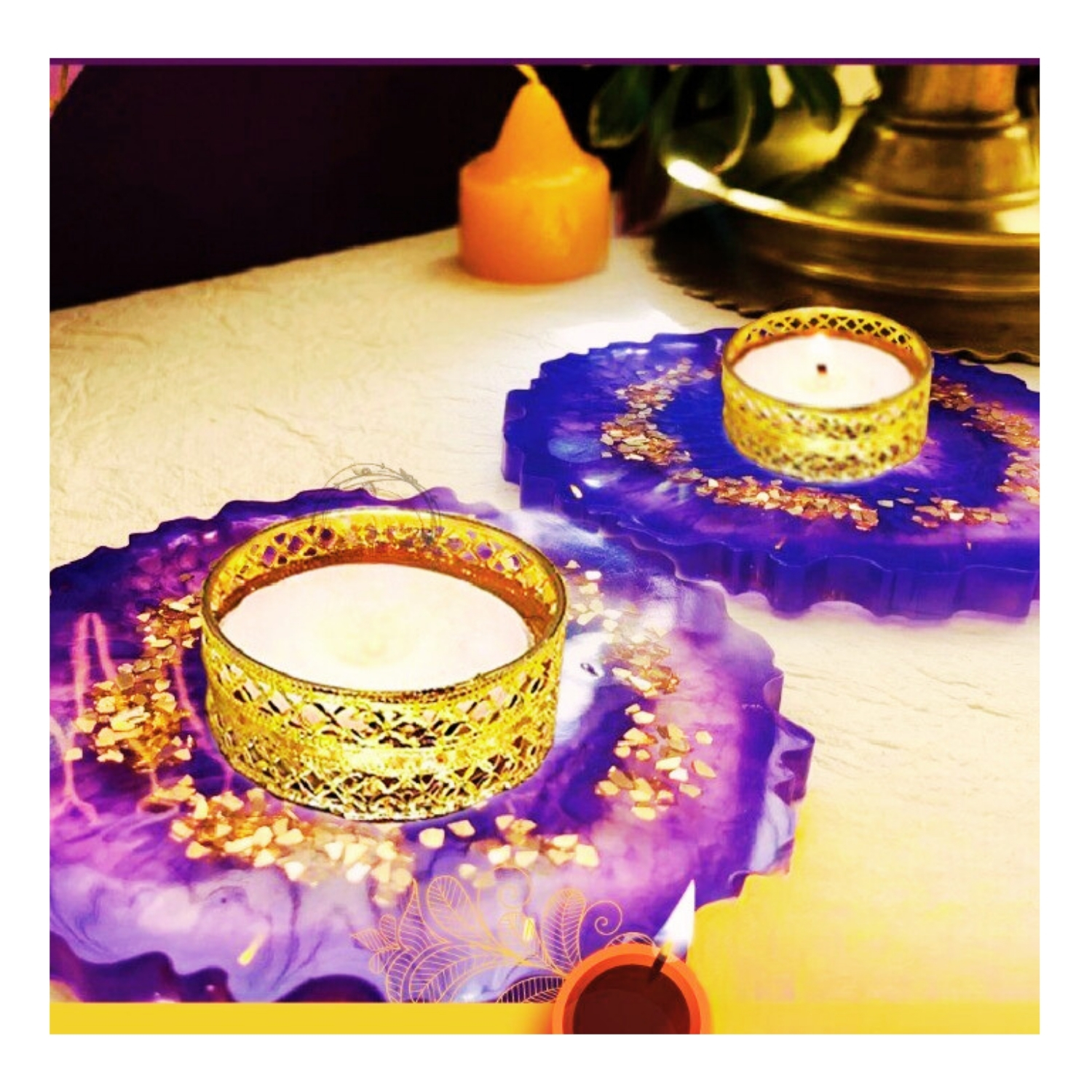 Coating on canvas & paintings, designer coasters, trays, handcrafted jewellery, keychains, curated photo frames, bespoke decorative creation, designing resin clocks, geode art, ocean wave effects for artistic projects, encasing flowers, marriage garlands and keepsakes in transparent resin blocks, coating on drawer knobs, other small decorative items.